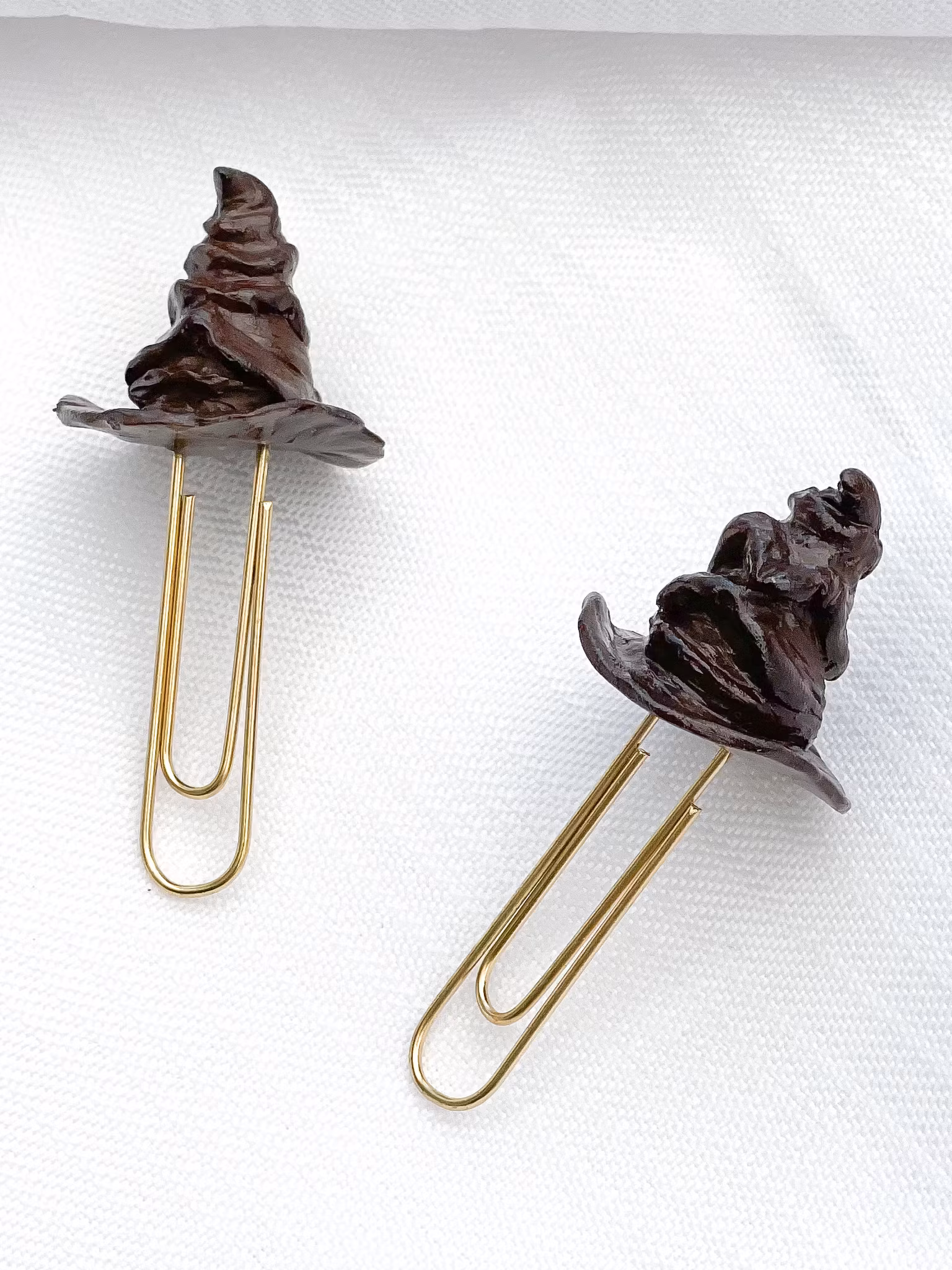 Bokmärke i form av sorteringshatt. Skulpterad för hand av polymerlera. Lackad med matt lack.