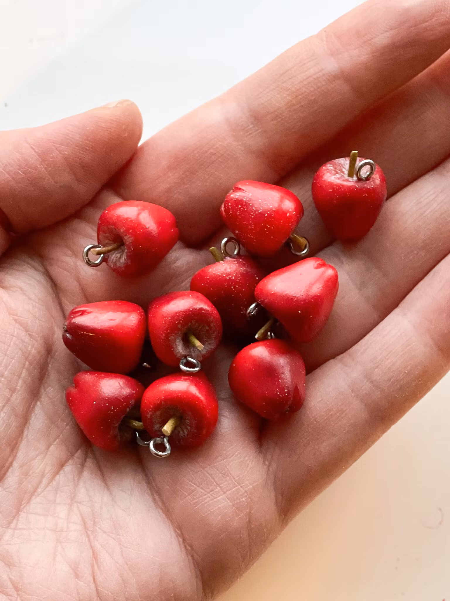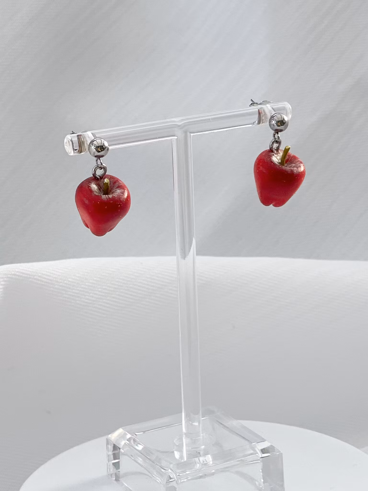 Handgjorda röda äpplen i polymerlera. Öronstift med kula i kirurgiskt stål.