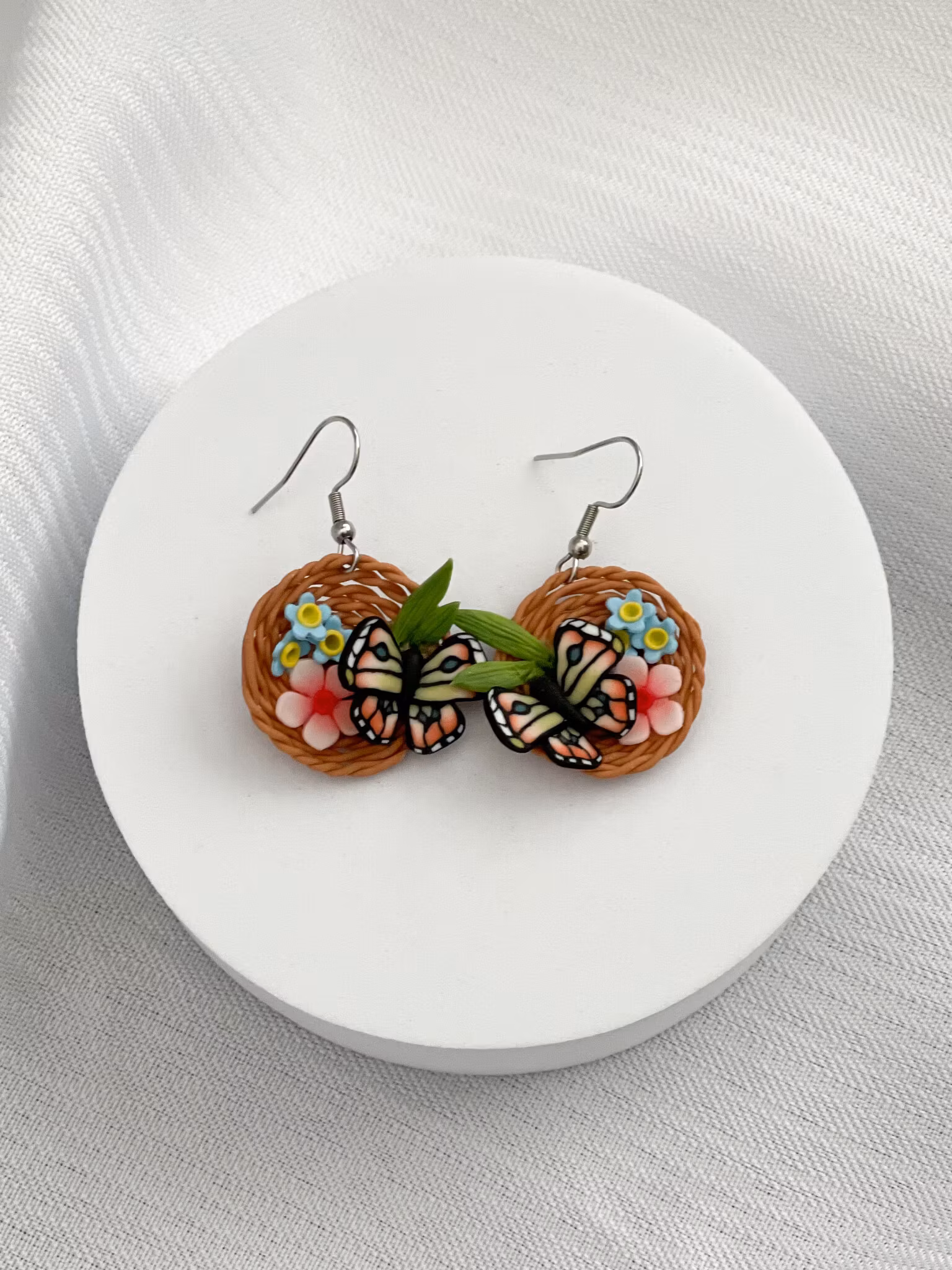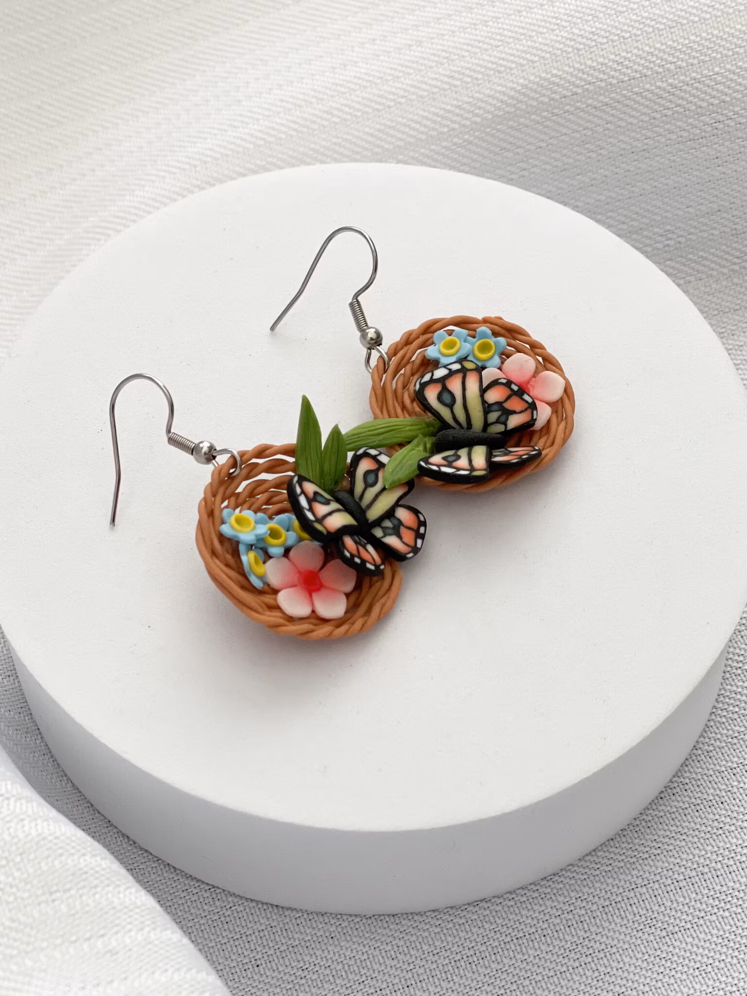 Blomkorgar med fjärilar, handgjorda i polymerlera.