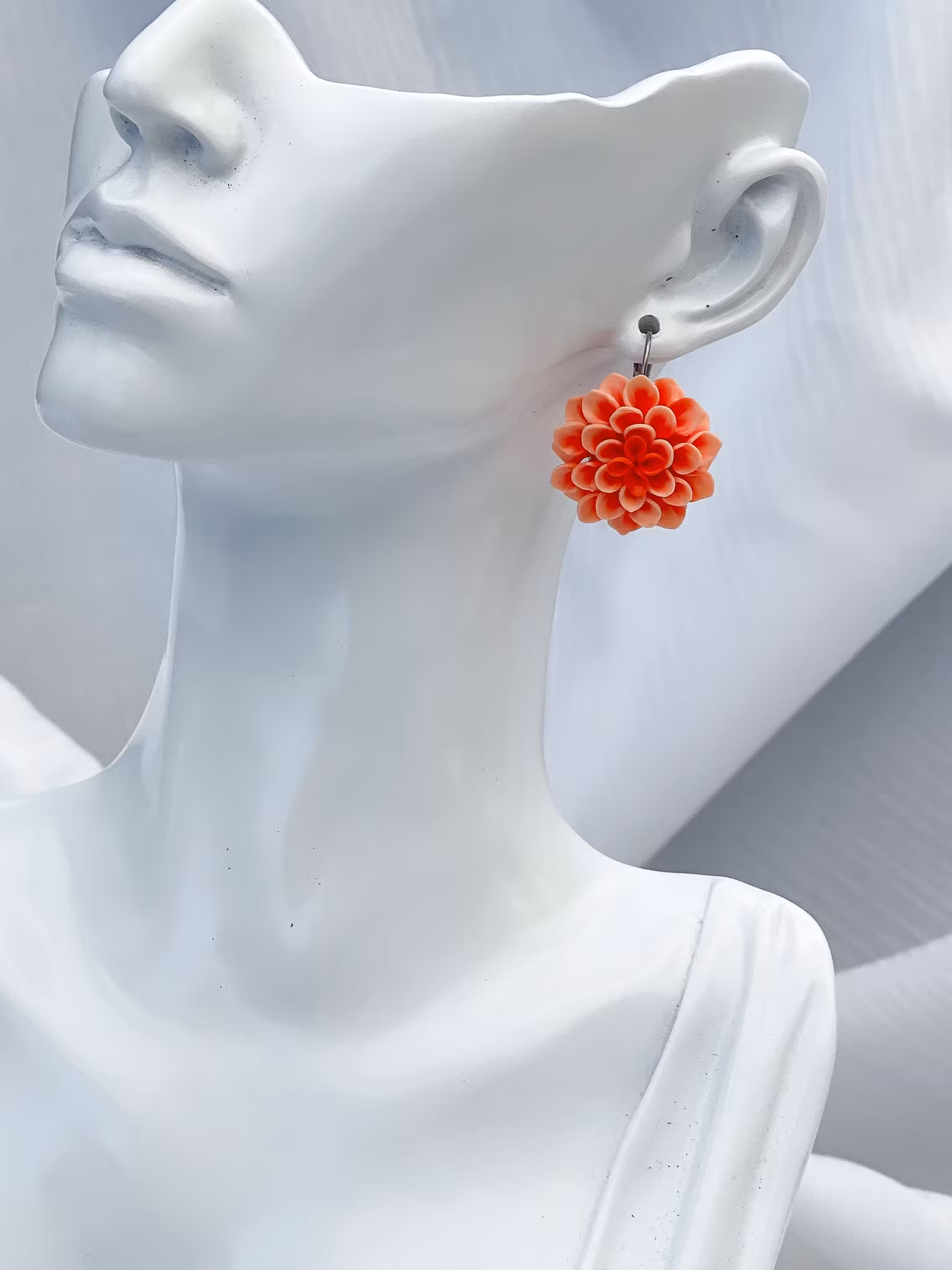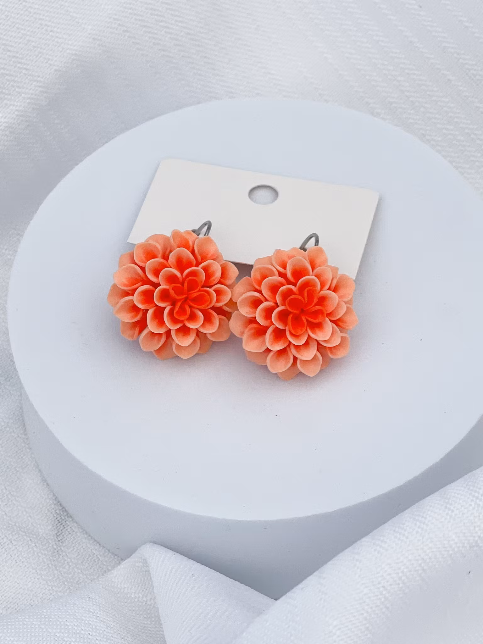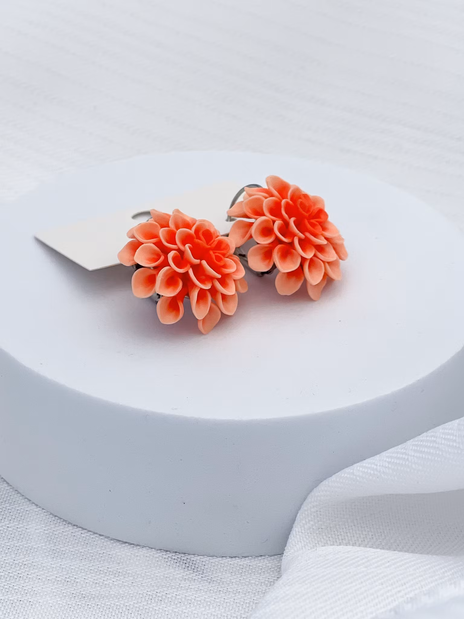 Handgjorda dahliaörhängen av polymerlera i aprikos-gammelrosa.