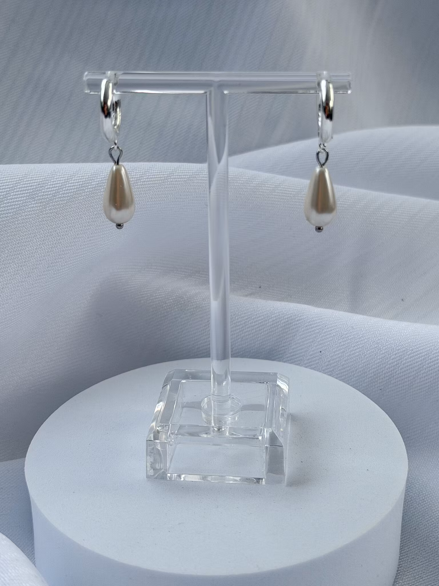 Creoler i silverfärgat kirurgiskt stål. Droppformade pärlor som hängen.