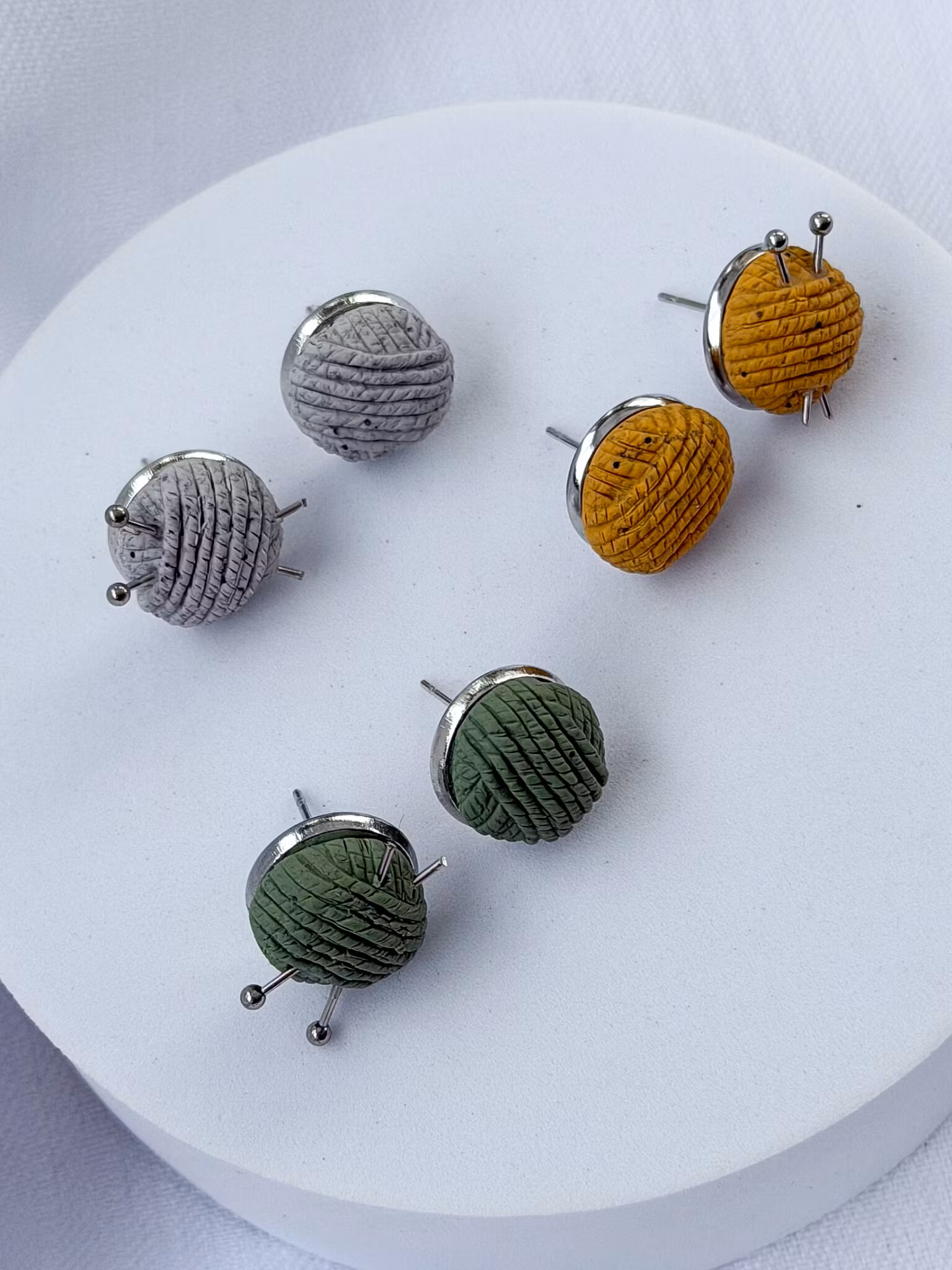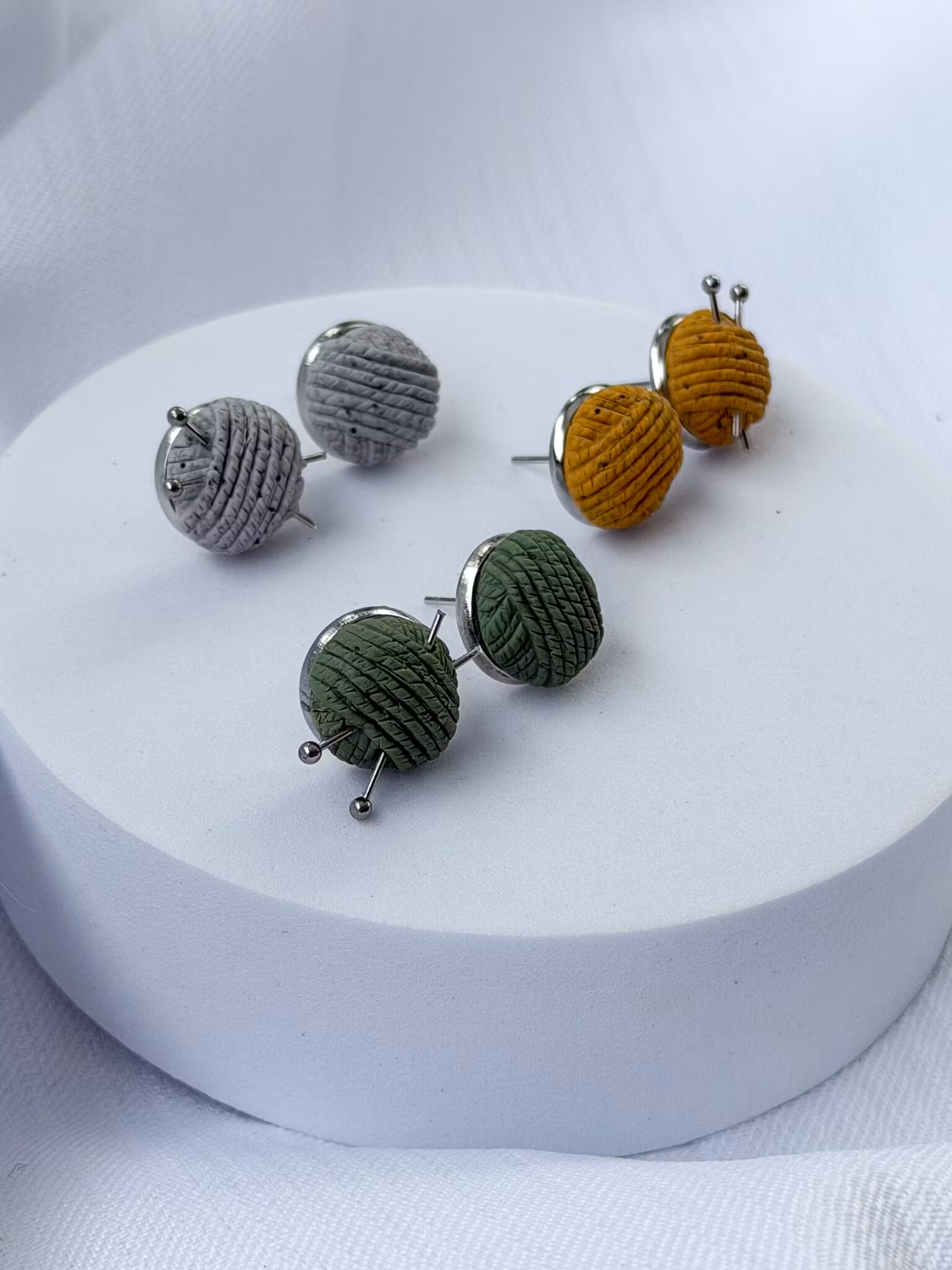 Handgjorda halva garnnystan av polymerlera, ena nystanet med stickor i. Öronstift med infattning, av nickelsäkert rostfritt stål. 3 olika färgval finns.