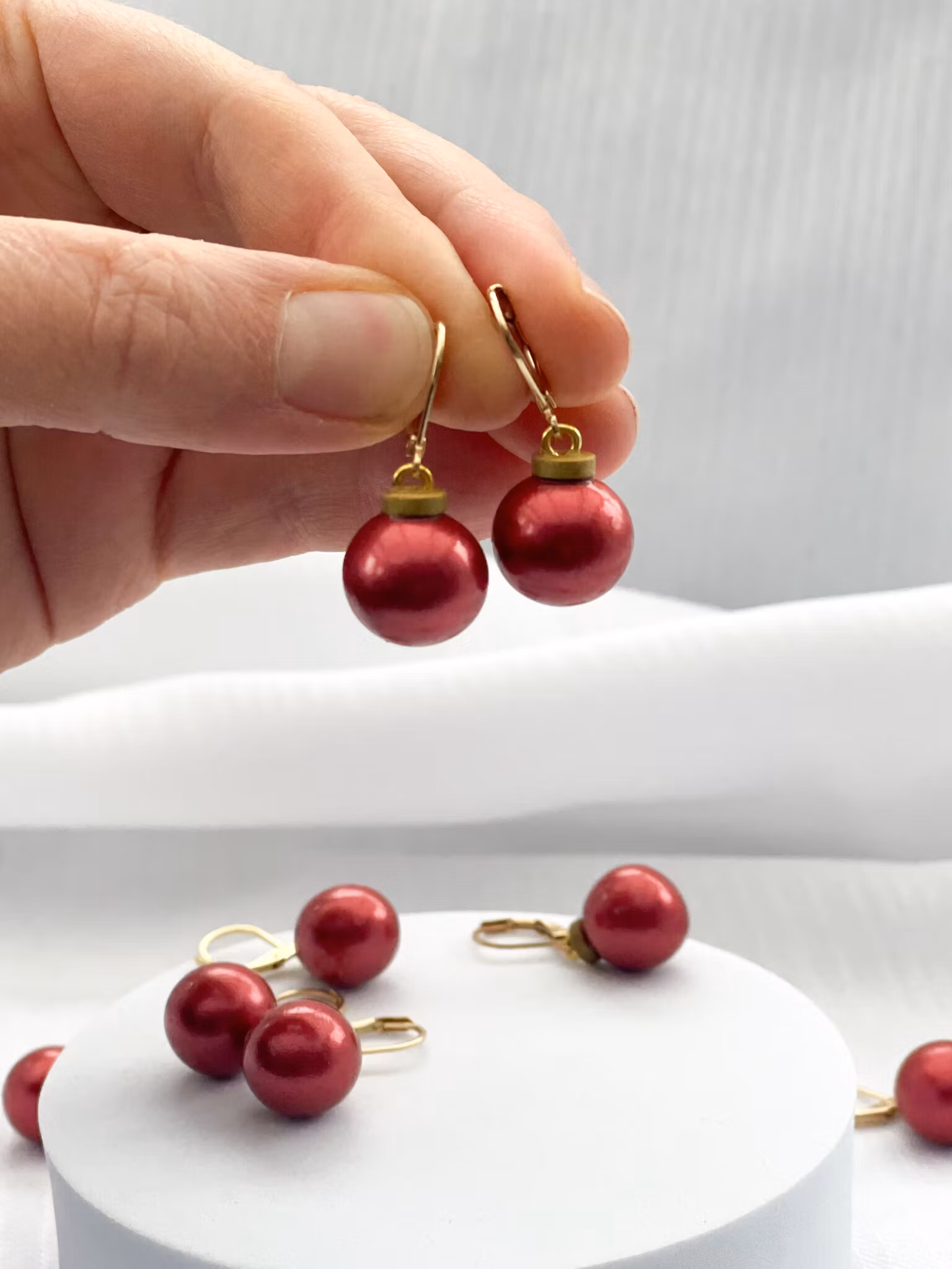 Handgjorda rödskimrande julkulor av polymerlera. Bristyrkrokar i guldpläterat kirurgiskt stål.