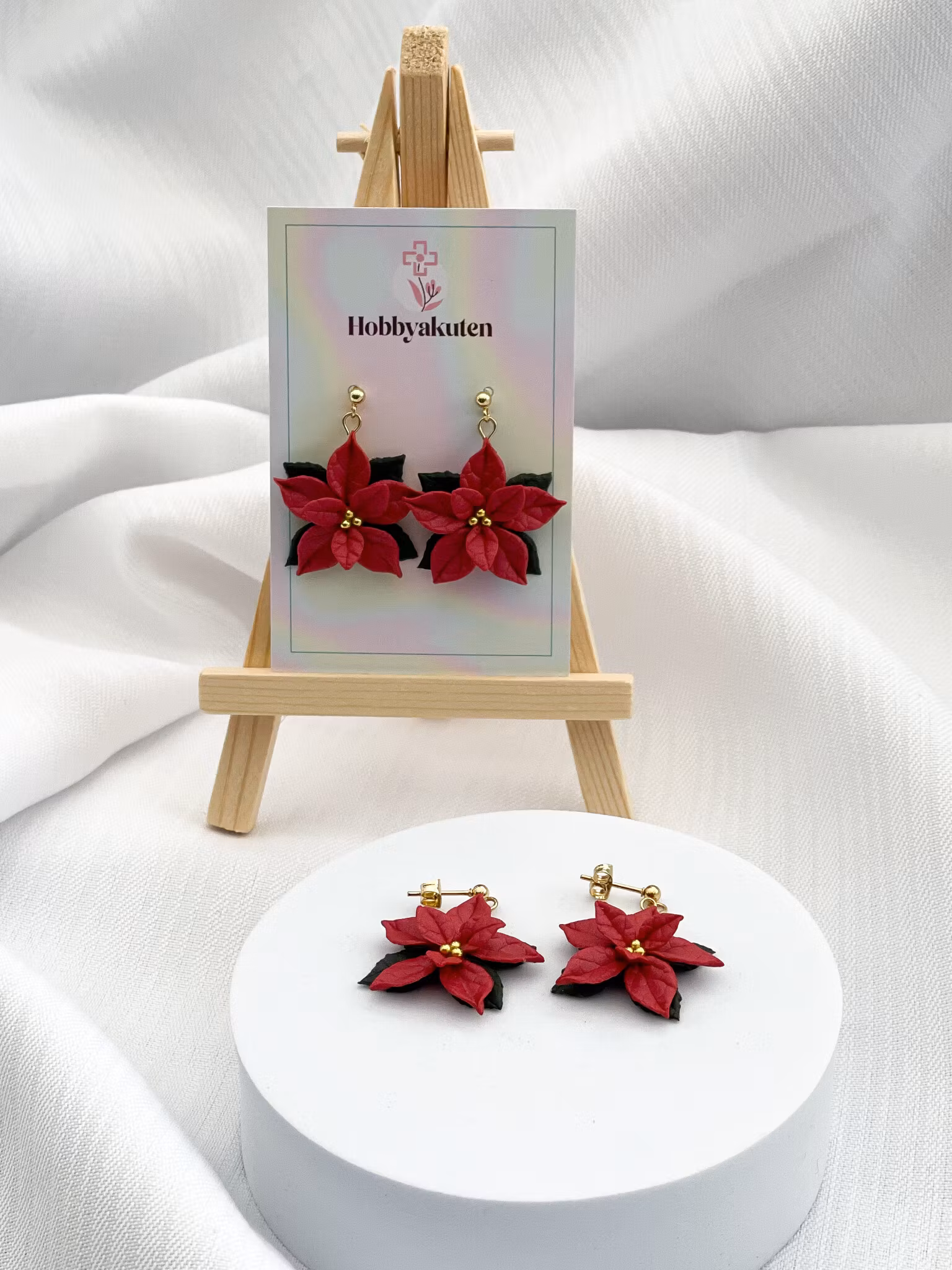 Julstjärnor med metallpistiller, handgjorda av polymerlera. Öronstift med kula i guldpläterat kirurgiskt stål.