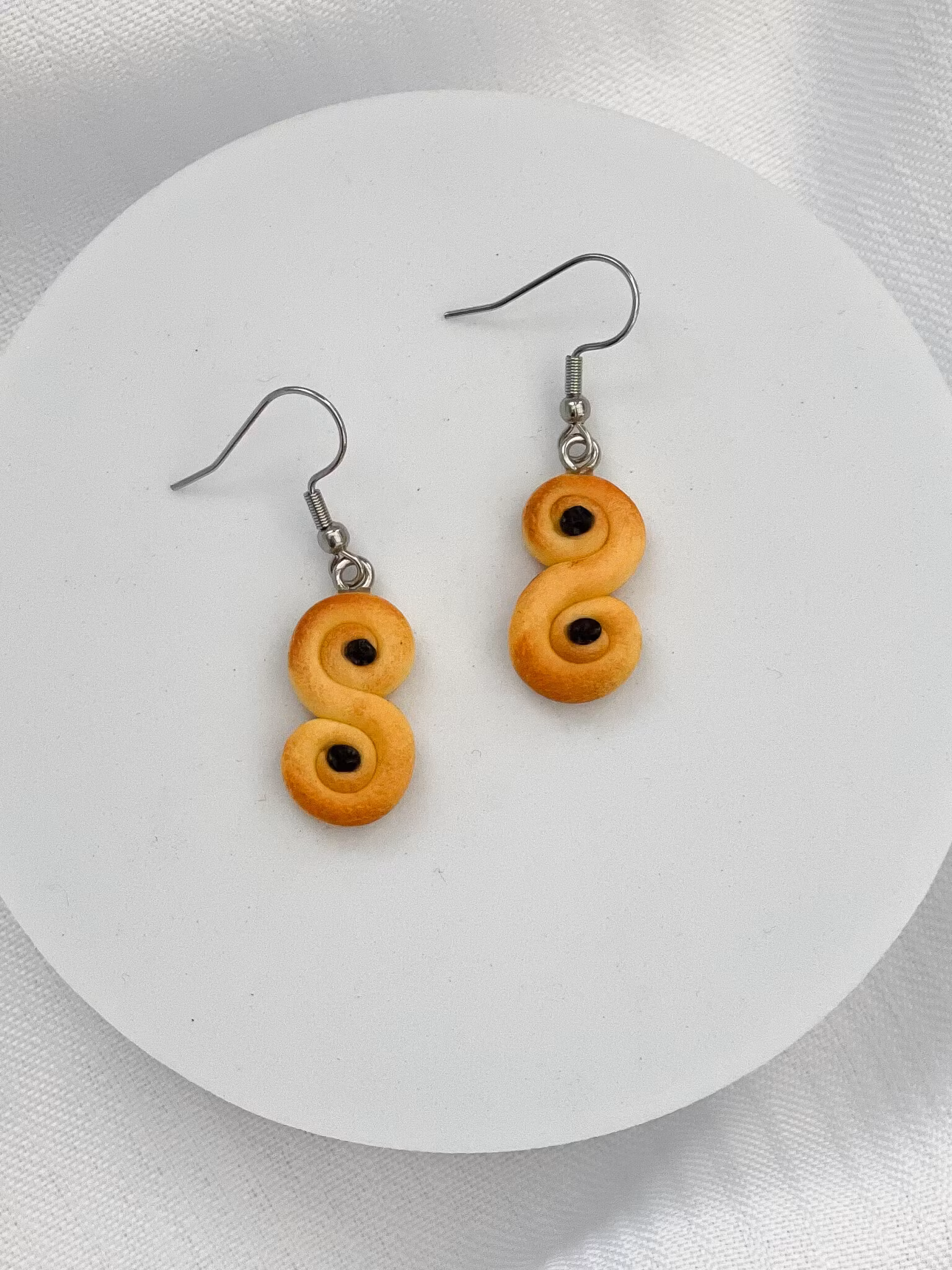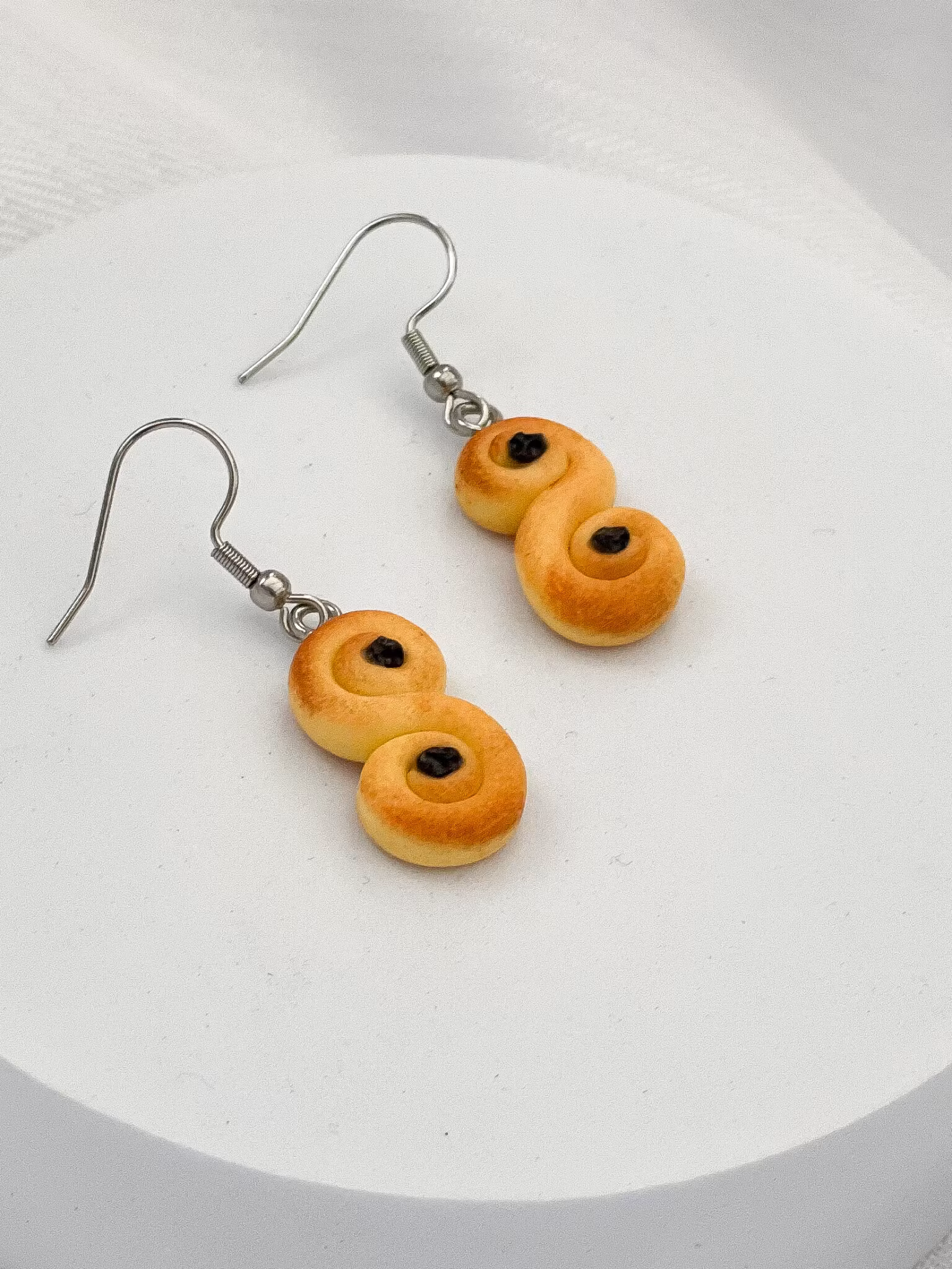 Handgjorda lussebullar i polymerlera. Öronkrokar i kirurgiskt stål.