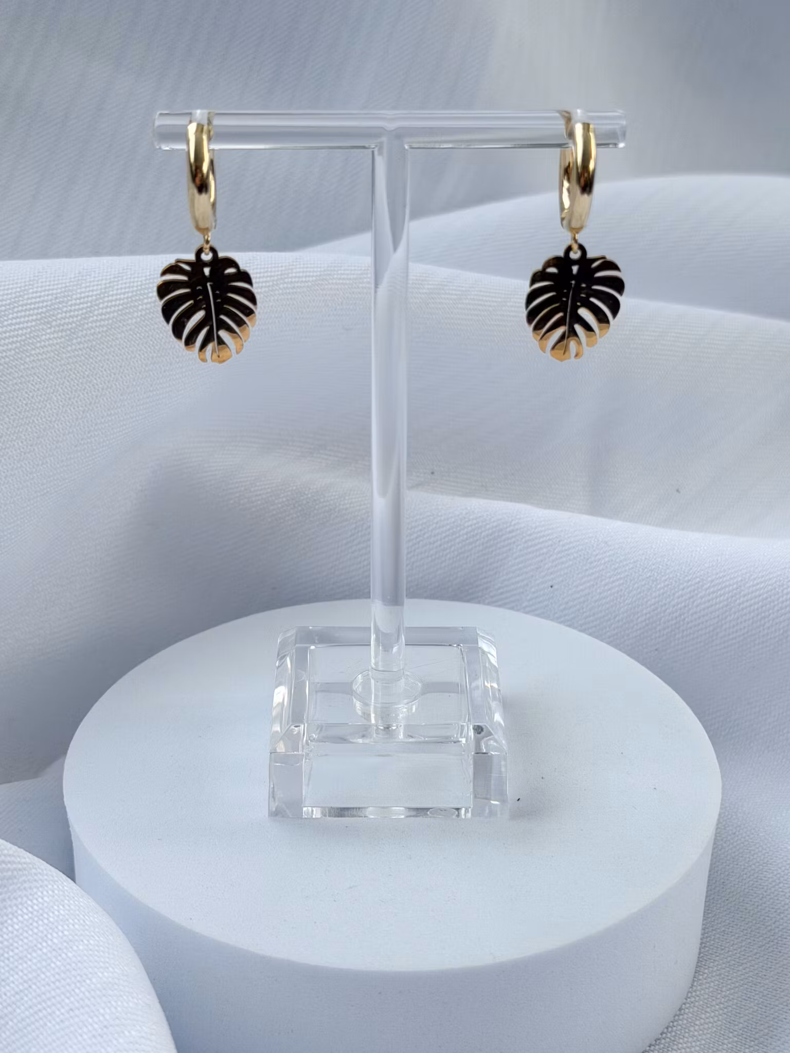 Creoler i guldfärgat kirurgiskt stål, PVD plätering. Berlock i form av monsterablad i guldfärgat rostfritt stål.