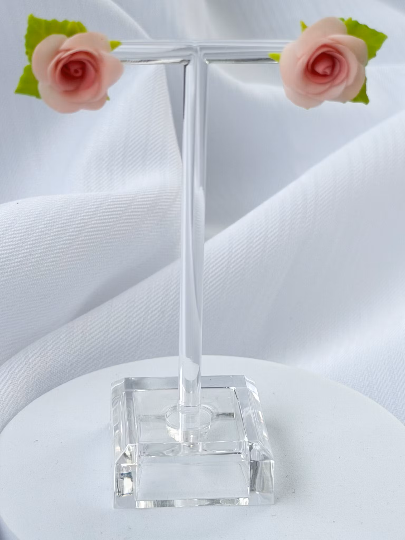 Lite större rosor med blad som stiftörhängen, välj mellan rosa eller röda. Handgjorda av polymerlera.