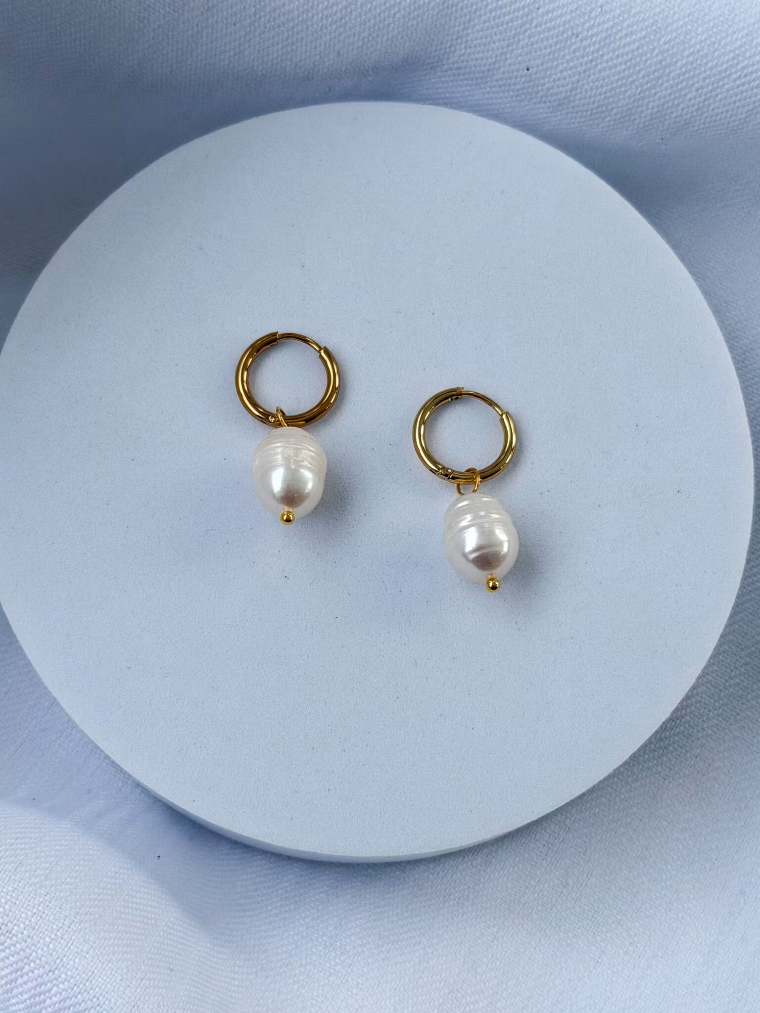 Tunna creoler i guldfärgat kirurgiskt stål, PVD plätering. Berlock med äkta sötvattenpärla.