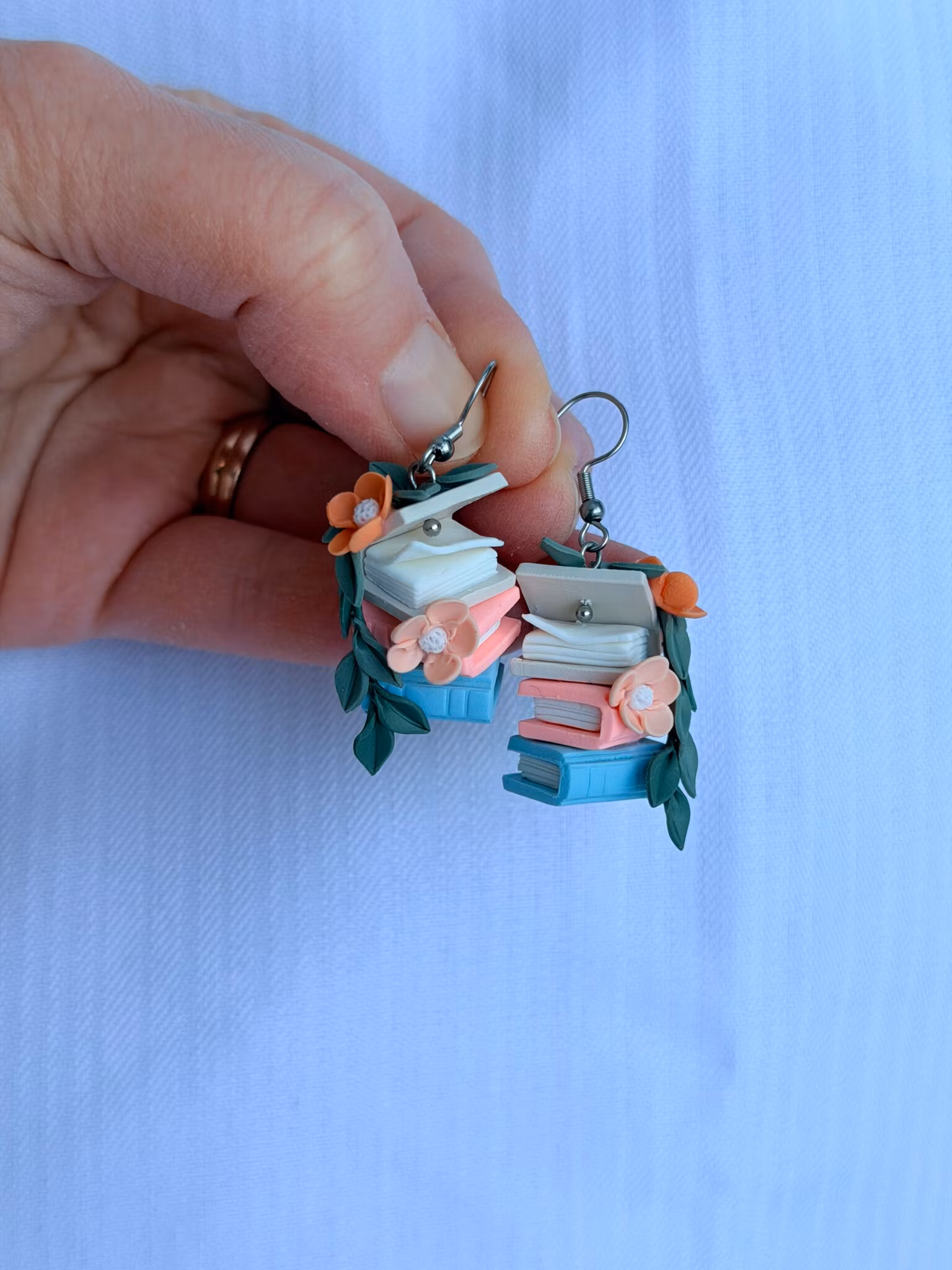 Staplade böcker dekorerade med blommor och blad. Allt handgjort av polymerlera.